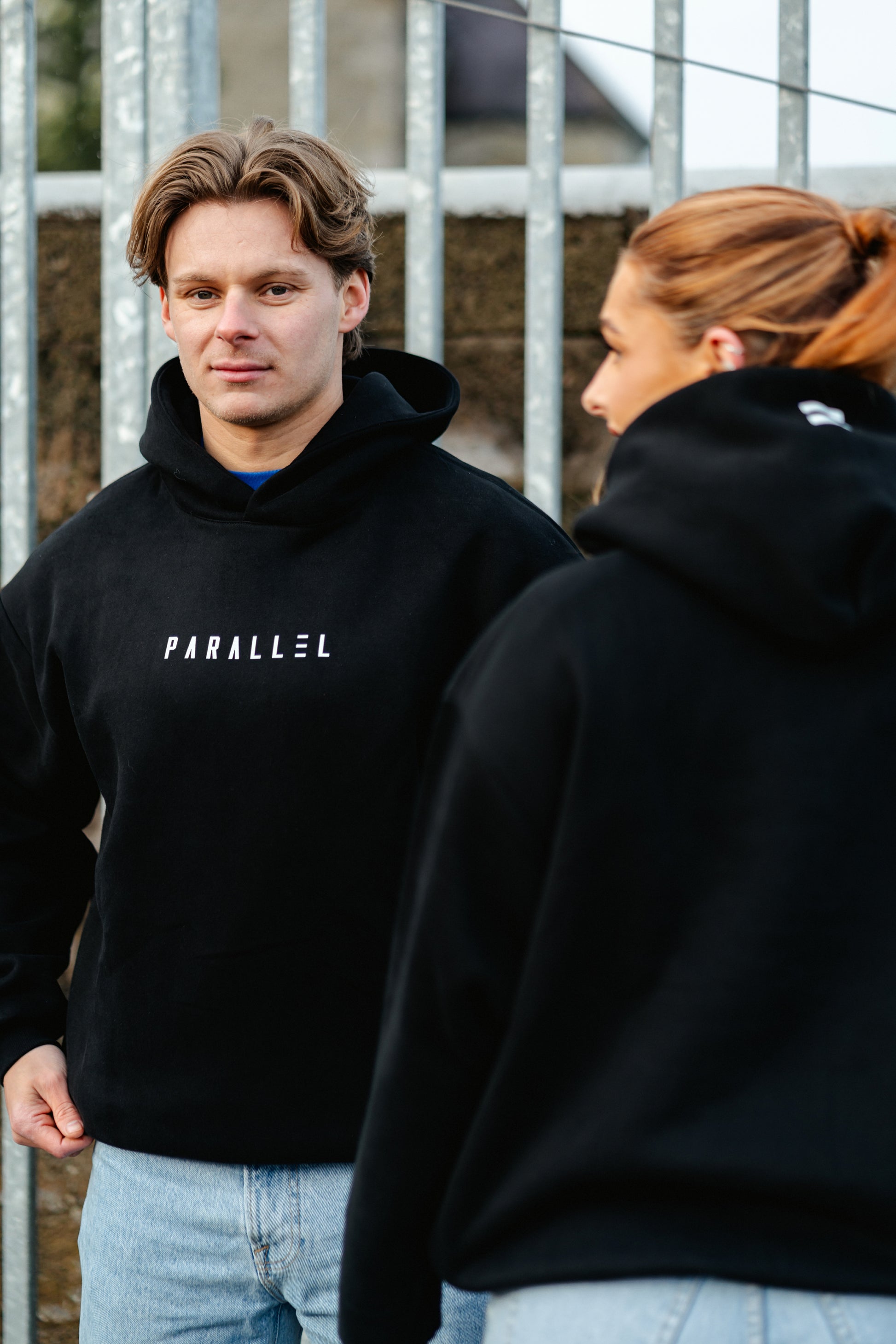 Our Black Unisex Hoodie boast a bold white font showcasing the Parallel name on the front and the iconic Parallel symbol on the back neckline
